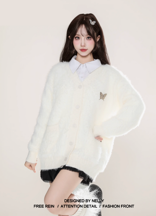 もこもこ蝶々ロゴ入りカーディガン