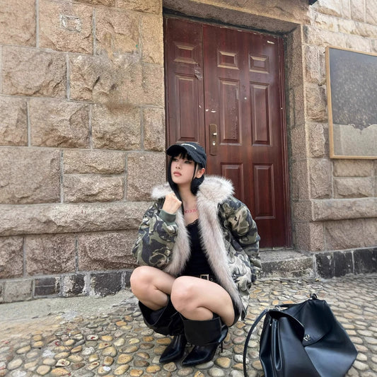 Y2Kミリタリーカモファーフードジャケット
